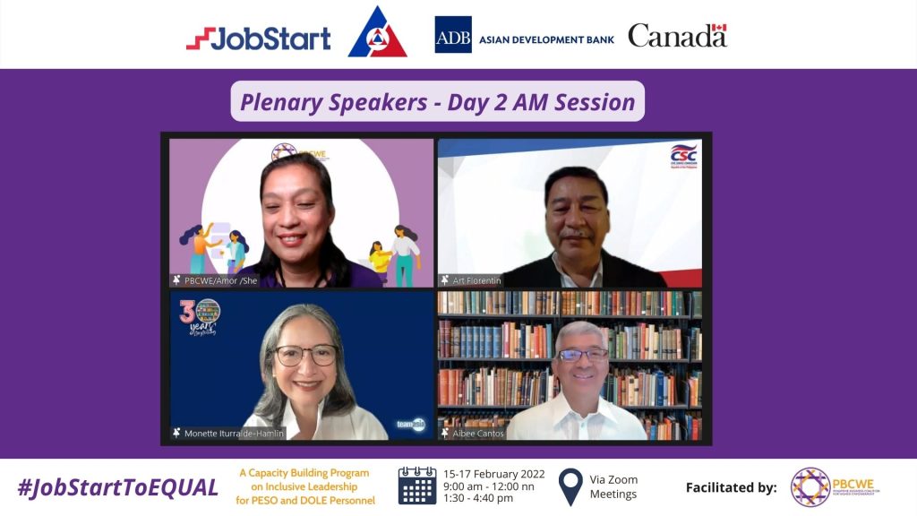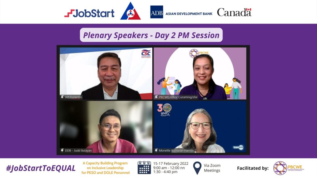 On 15 and 17 February 2022, JobStart Philippines, a youth employment facilitation program implemented by the Department of Labor & Employment, with support from the Asian Development Bank and the Government of Canada, held a two-day online workshop for Public Employment Service Office (PESO) officers and regional DOLE officials on gender-sensitive delivery of employment facilitation services. It was facilitated by Philippine Business Coalition for Women Empowerment.